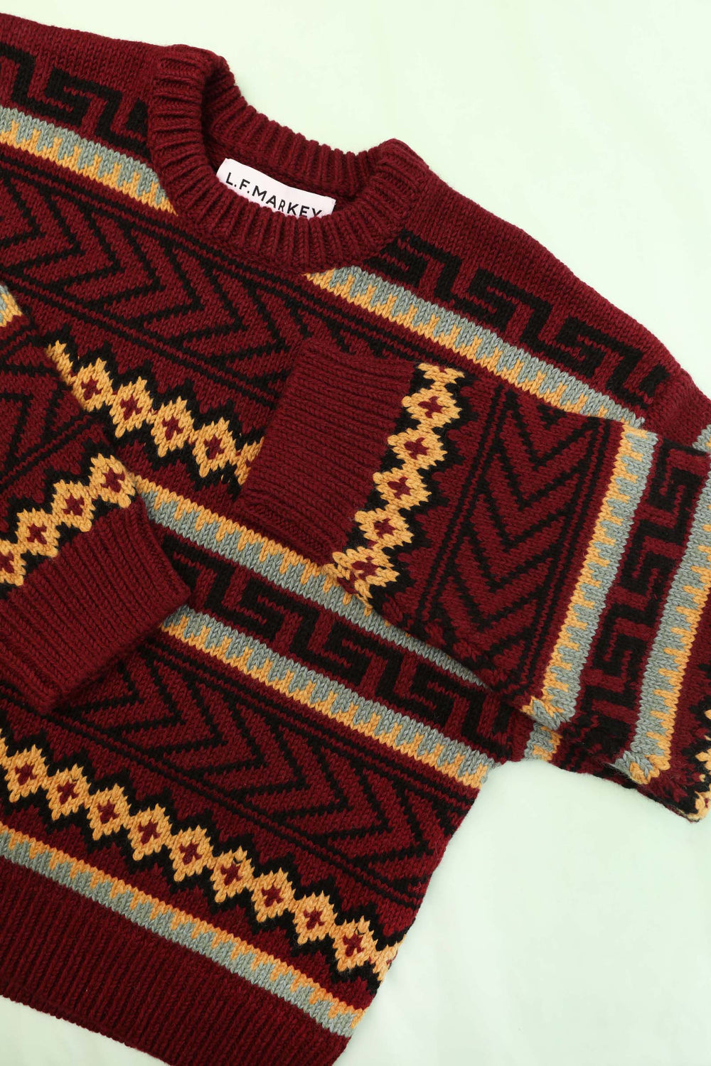 The Bjorn Knit has a boxy shape and a close fit ribbed neckline, cuff and hem. Crafted from a wool blend in our Burgundy Intarsia pattern.