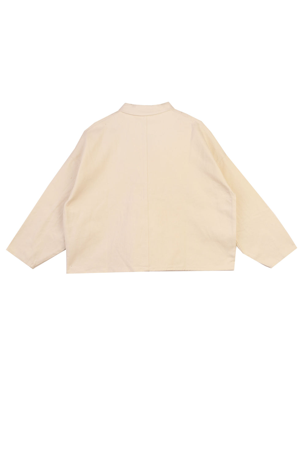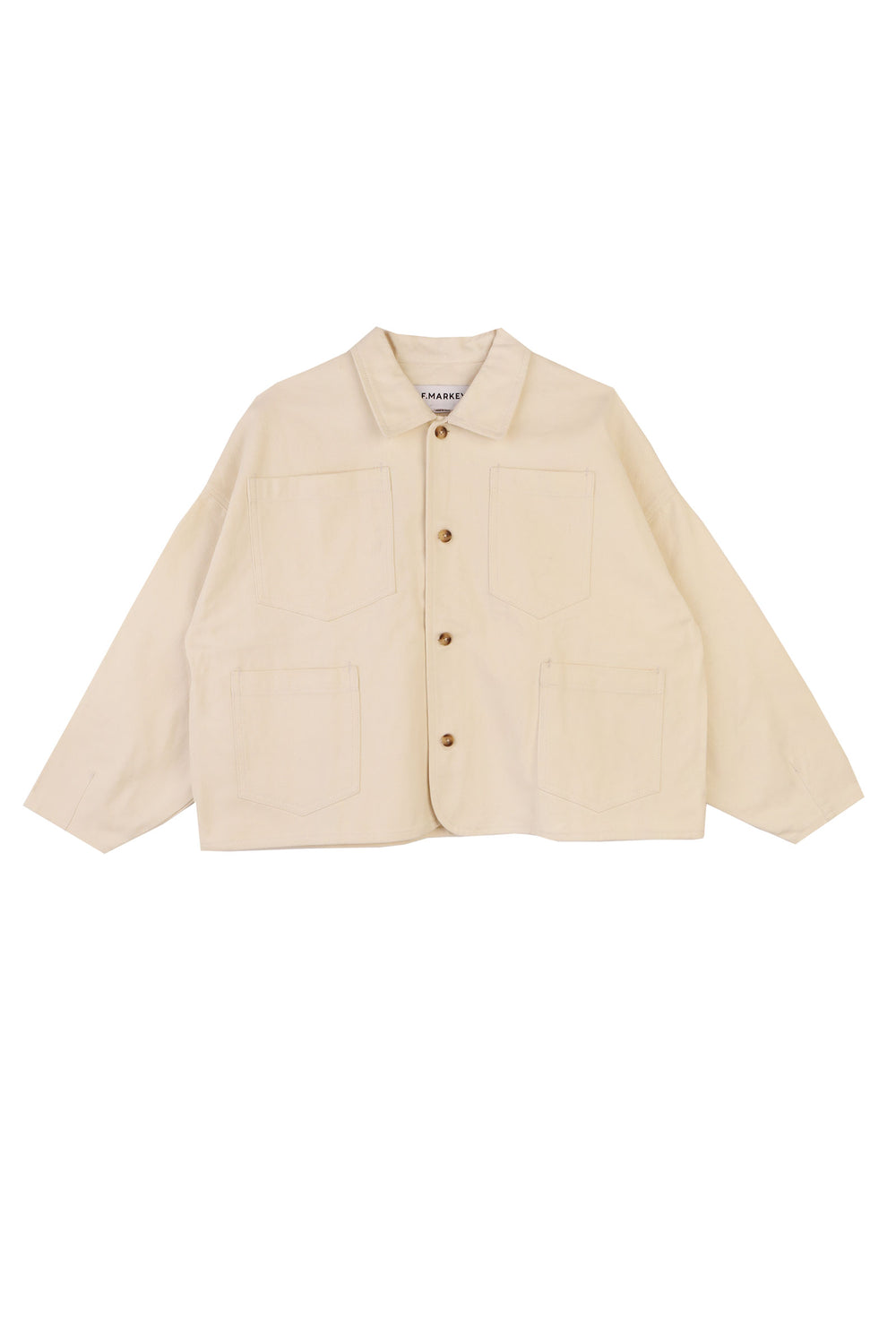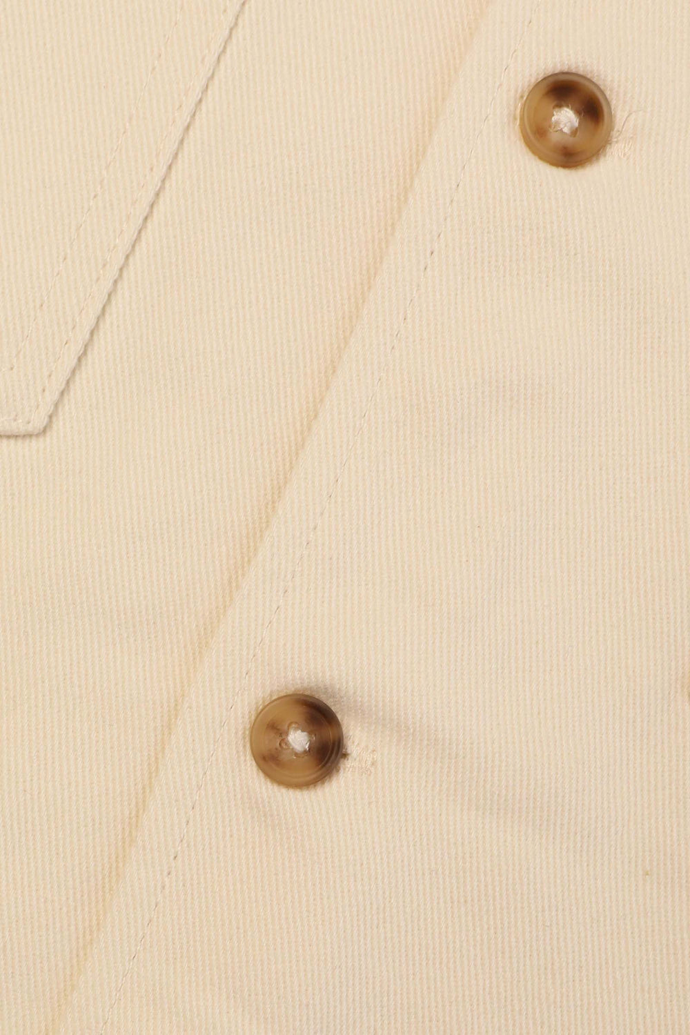 Cut to a boxy silhouette, it retains the pragmatic codes of its origins with utility-style patch pockets and sturdy imitation horn buttons.