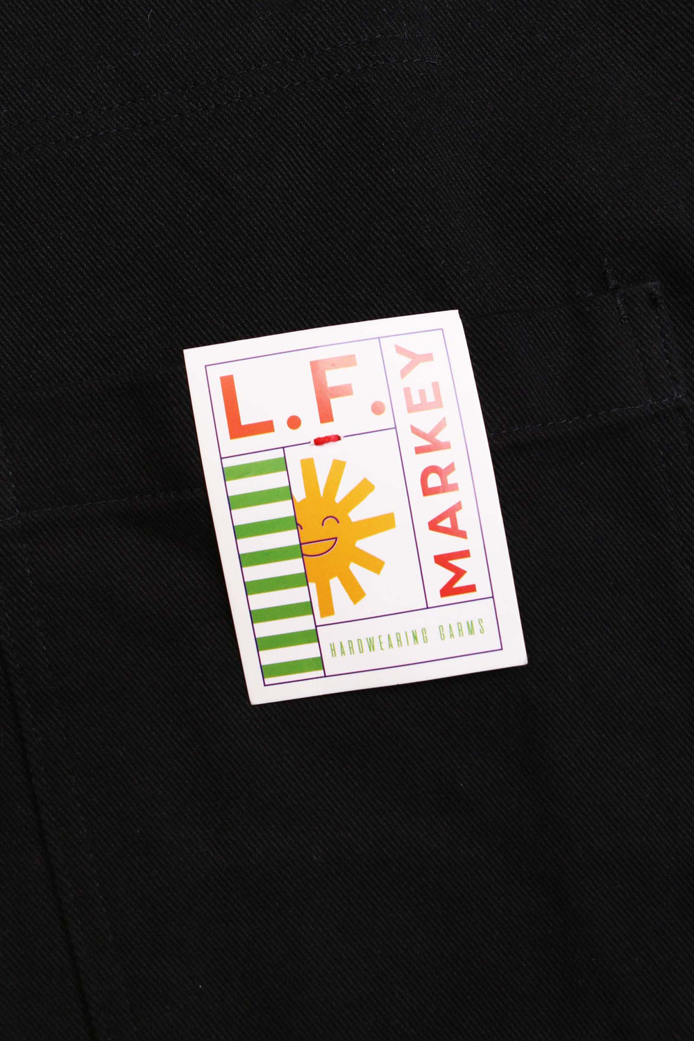 Our take on a classic chore coat with a wide boxy shape, voluminous sleeves and imitation horn buttons down the front. With side seam pockets, front patch pockets and a large removable cardboard label on the left pocket. In classic black cotton canvas with our signature sun and wave woven patch logos dotted throughout.