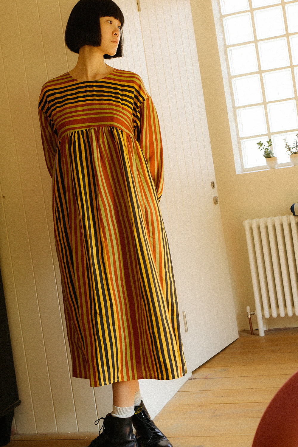The Alder Dress is a midi length dress with a spacious relaxed fit, in a soft linen rayon blend fabric. Features an empire waistline gathered below the bust adding volume to the skirt. With longsleeves, side seam pockets, a round neckline fastened with a zip at the back. In our earthy Painter's Stripe print.