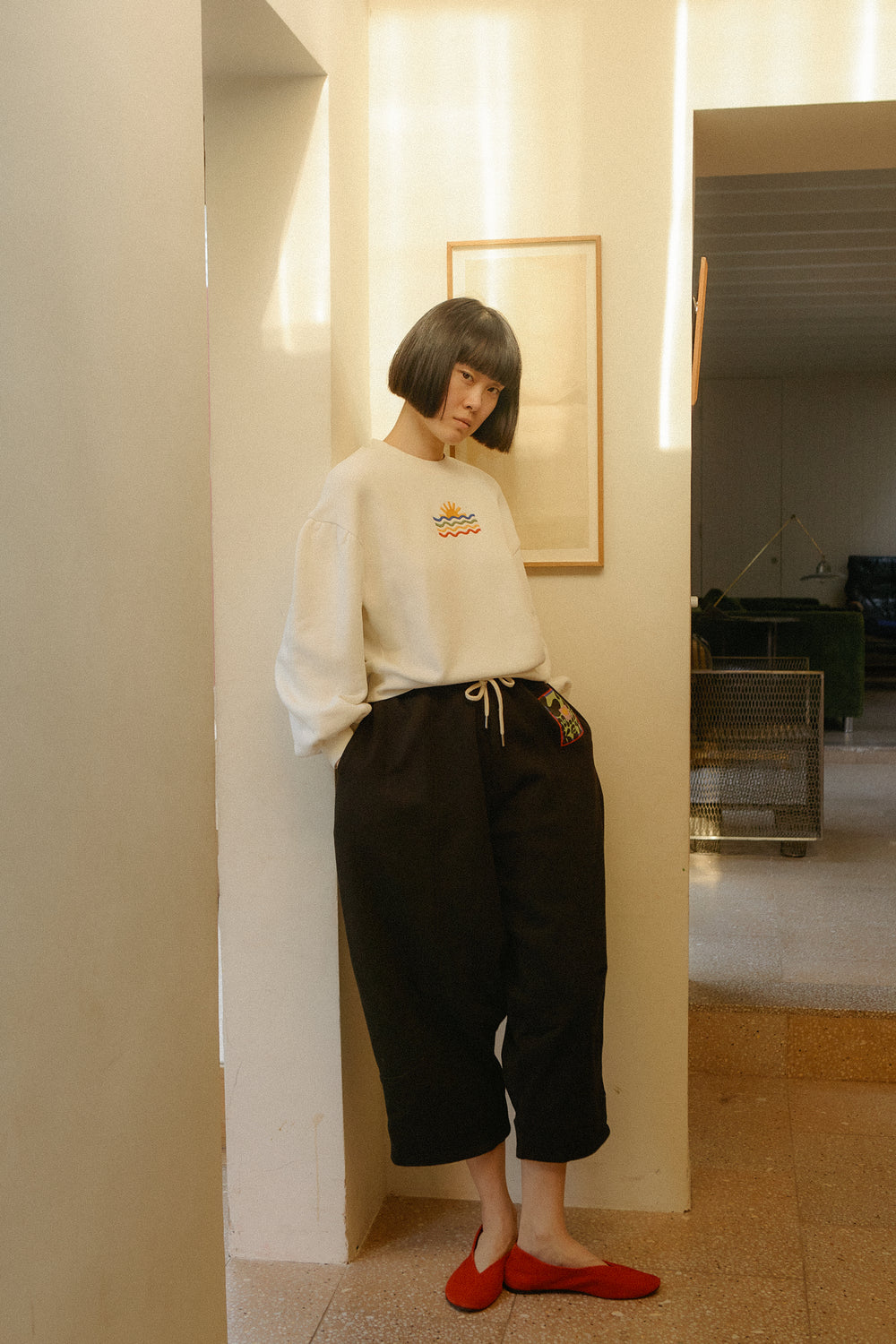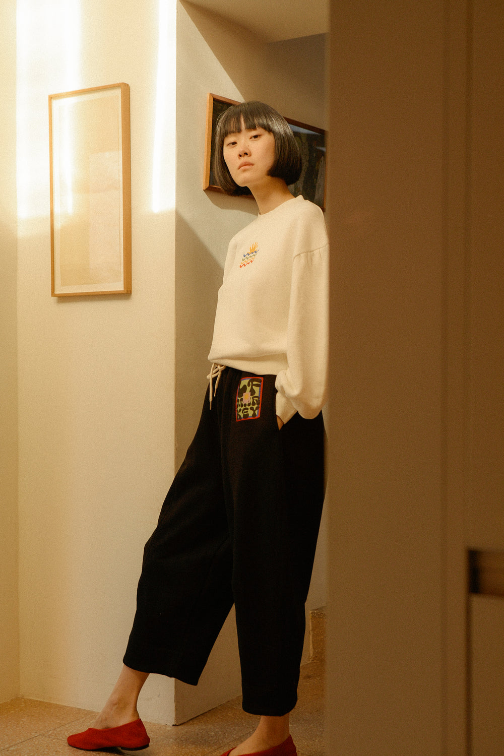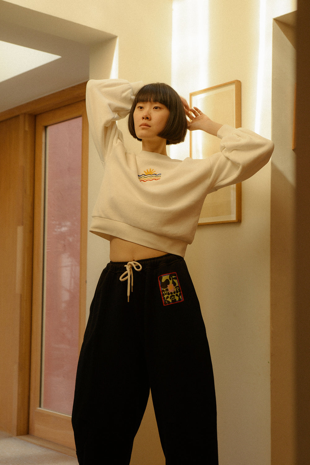 Loungewear. Barrel leg. High-waist. Cotton fleece. Drawstring.
