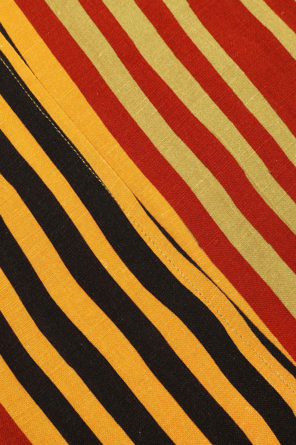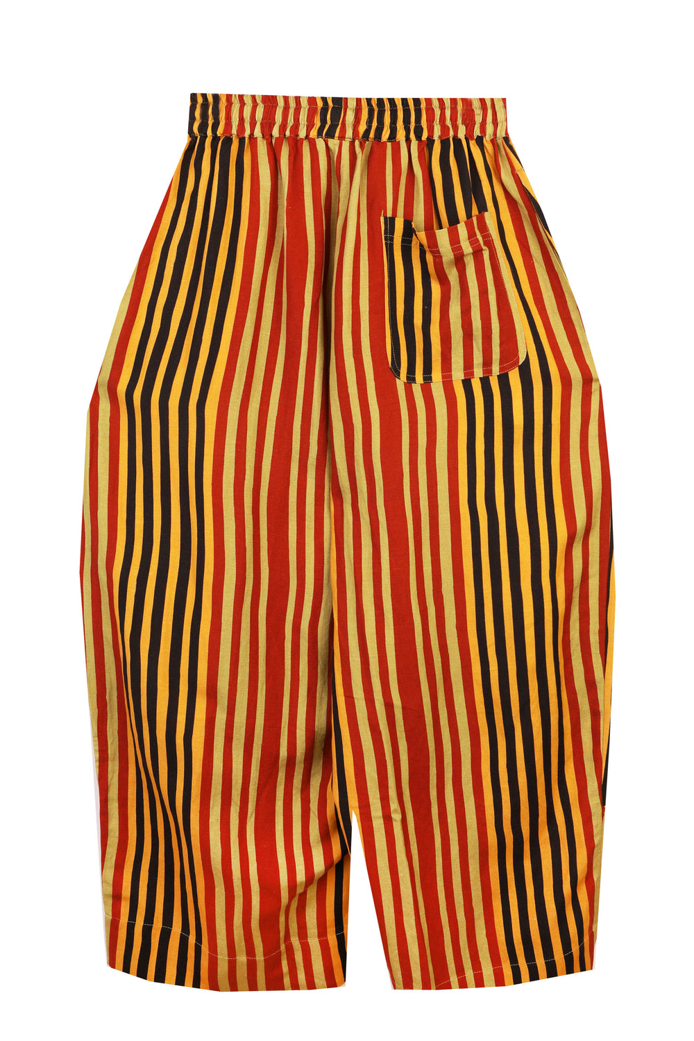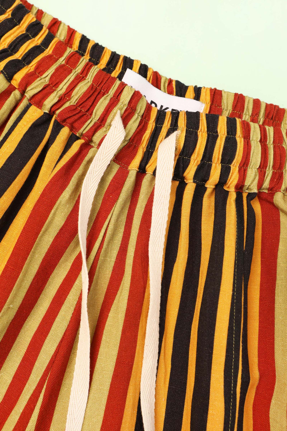 The Camden Trouser has a barrel-shaped leg and a high waistline fastened with a cream herringbone drawstring. Crafted from a soft linen rayon blend, in our earthy Painters Stripe print. With side seam pockets and a back patch pocket.